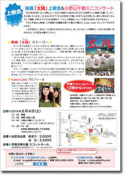 まだご覧でない方はこの機会にぜひともご覧下さい! また、前にご覧になった方も、再度ご覧になってみて下さい。10年の歳月で同じ映画でも感じる所が違うので面白いですよ。これも、映画の楽しさです。 そして、この映画には沢山の方々が関わって下さいましたが、この機会に再会できたら嬉しいです。 当日は、映画上映会終了後、映画「太陽(てぃだ)」の主題歌を歌う、小野山千鶴(Luma Luma)のミニライブもあります。 後、イベント前後、1時間、沖縄マルシェ&バー(沖縄物産店)も開催されます。 ←左の画像、下のリンク先をクリックすると、詳細が記載されたPDFファイルが開きます。詳しい内容はPDFファイルよりご覧下さい。 [ PDFファイルを開く ] |