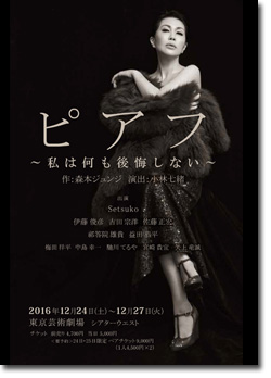 東京芸術劇場 シアターウエスト エディット・ピアフと、彼女を愛した7人の男たちのショートストーリー。 ストーリーが重ねられていくと同時に、ピアフの生きざまが映し出されていく。 その生きざまに魅き込まれ、やがては自分の人生を重ねあわせていくことになるかもしれない。 2016年冬、クリスマスにはぜひ、「愛」がテーマの忘れられない舞台を大切な方と共に──。 ←左の画像、下のリンク先をクリックすると、詳細が記載された特設ページが開きます。詳しい内容は特設ページよりご覧下さい。 [ 特設ページを開く ] |
